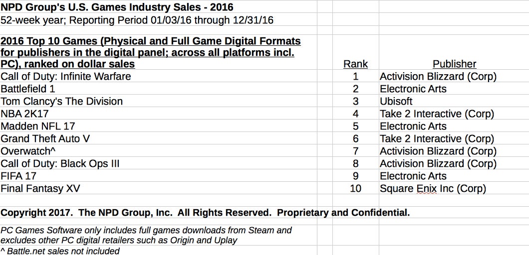 He added, "Total hardware spending for 2016 reached $3.7B, a decline of 24 percent versus 2015. Unfortunately the release of the Xbox One S and the PlayStation 4 Pro did not generate dollar spending growth. Although the combined ARP for the Xbox One and PlayStation 4 systems decreased by 15 percent, consumers bought 7 percent fewer units."
