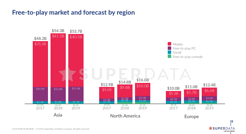 The dominant business model was free-to-play, which accounted for 80% of all digital games revenue in 2018 -- around $88 billion in total, of which 62% was earned in Asia.