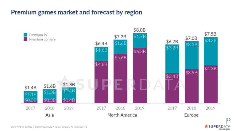 It was also a sector dominated by Western territories. North America and Europe contributed four of every five dollars (80%) spent on premium games in 2018, driven by the steady migration of sales from physical copies to digital downloads.