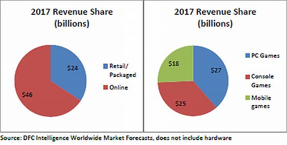 Globally, the PC platform is broadest, according to Cole's data. He projected that even in 2017 that PC games will still have the greatest share of global game revenue at $27 billion, followed closely by console games at $25 billion, with mobile games accounting for $18 billion. "There's great data out there on consoles, but not such good data in the PC space," said Cole. DFC therefore looks to partner with people who have good data, such as Xfire (social network for gamers with 22 million users) and Live Gamer (which provides a micropayment platform to 95 million users worldwide).