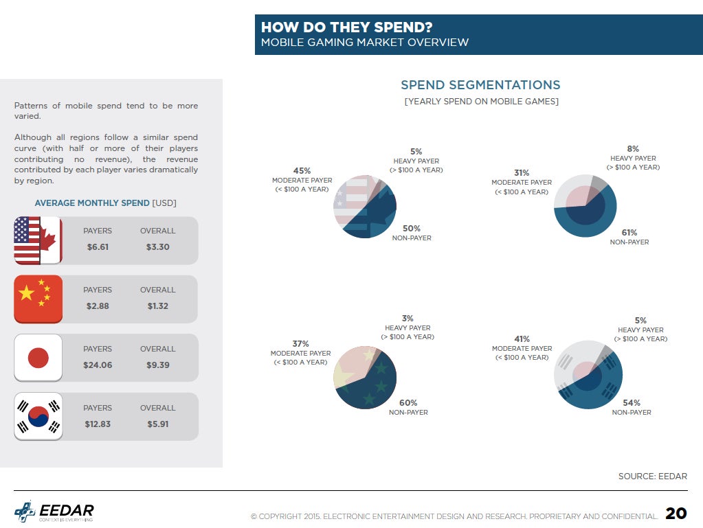 Also of note is the change in spending patterns across regions. Japan easily has the highest percentage of heavy spenders (greater than $100 a year) at eight percent but at the same time the country also has the highest percentage of non-spenders at 61 percent. The US by contrast has the lowest percentage of non-spenders (50 percent) but a fairly high percentage (45 percent) of moderate payers, or people who spend under $100 a year on mobile games. The chart below has the full breakdown.