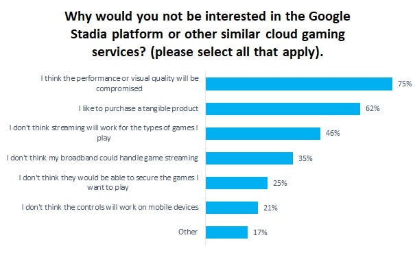 When asked about streaming services such as specifically Google Stadia, 73% of respondents indicated that performance or visual quality was a potential drawback they saw, which was the most-reported concern. Next highest was a preference for tangible products, with 36% indicating it as a drawback.