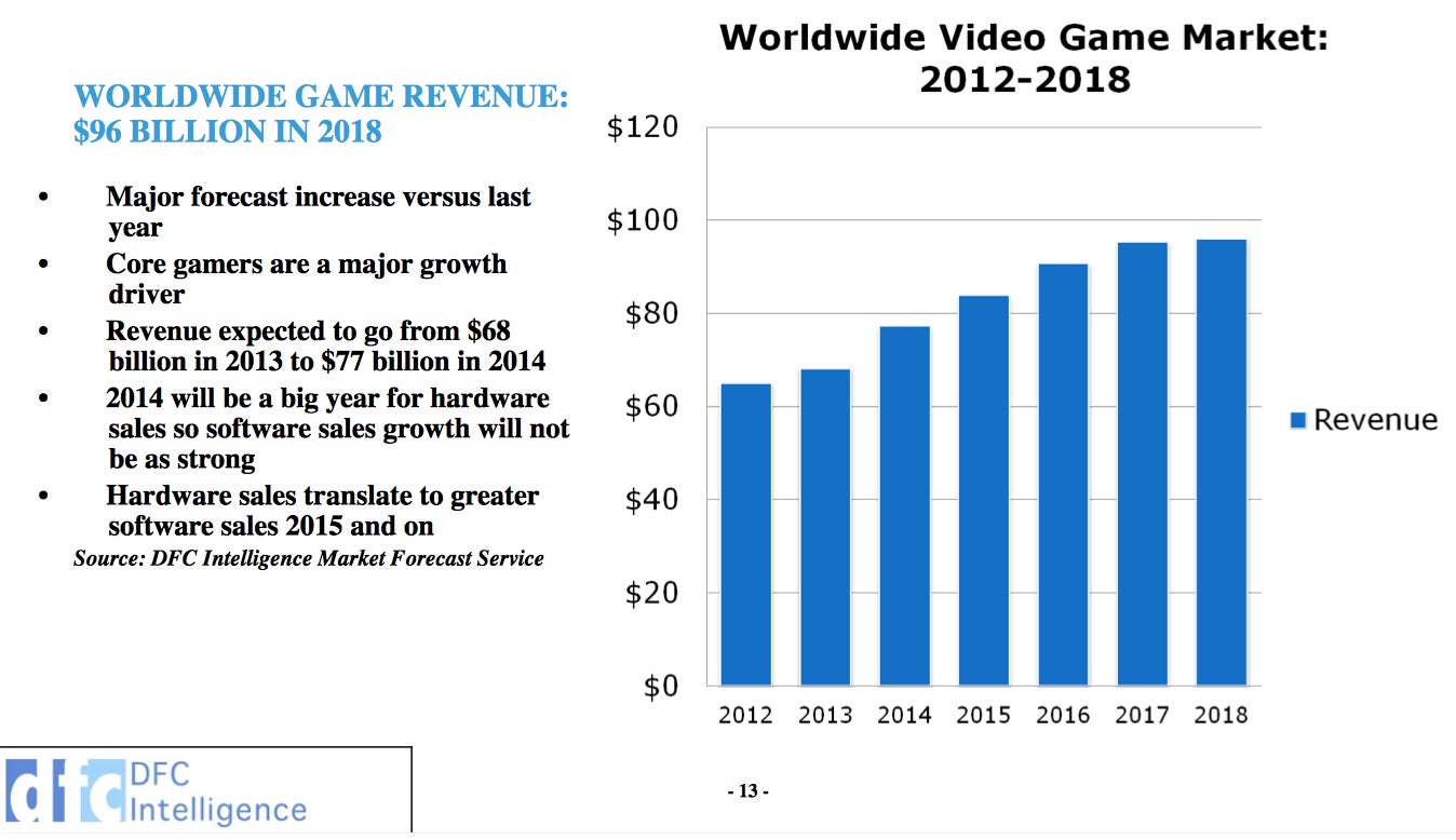 In its new report, shared exclusively with GamesIndustry International in advance of its release, the researchers at DFC Intelligence have raised their worldwide game revenue forecast to $77 billion in 2014 (up from $68 billion in 2013), and by 2018 the firm believes the industry will be fast approaching $100 billion, reaching about $96 billion. The reason for the buoyed optimism? DFC sees the "core gamer spending more than ever."