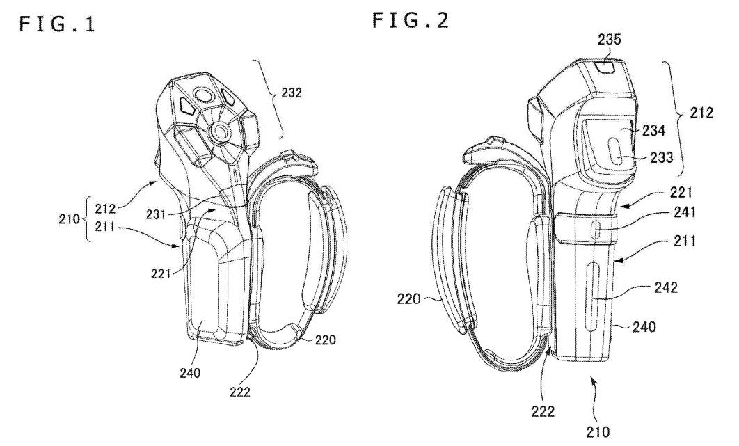 A pair of drawings in the patent show off the controller from the front and back. The most instantly noticeable change is that the giant light-up globe of the original PSVR / PlayStation Move controller is gone, replaced by a small LED panel (labelled 235 in the drawing above) that can emit light in a variety of colors. Naturally, it has a few interesting additions as well.