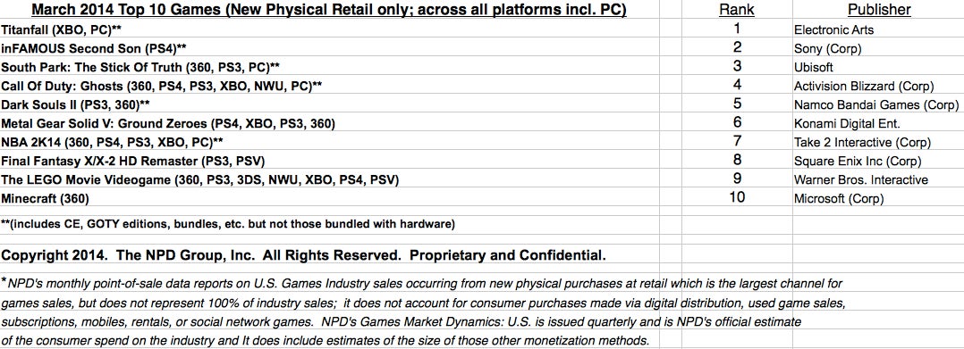 "Last March we saw eight of the top ten games were new launches with games like Bioshock Infinite, Tomb Raider, Gears of War: Judgment, God of War: Ascension. This March saw six of the top ten games as new launches with Titanfall, inFAMOUS Second Son, South Park: The Stick Of Truth, and Dark Souls II.”