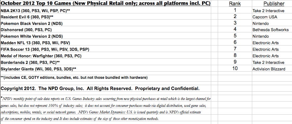 As for October, Take-Two's 2K Sports labeled enjoyed occupying the top selling spot in software as its NBA 2K13 outsold last year's version by 60 percent in both dollars and units.